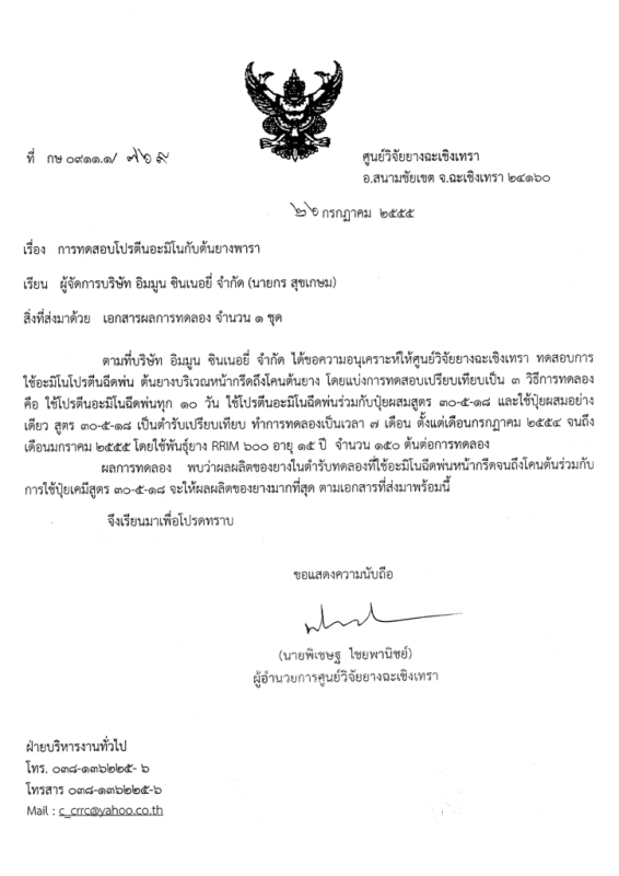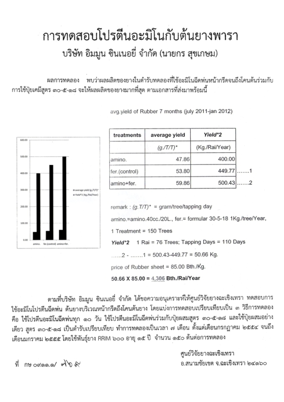 บริษัท อิมมูน อินเนอร์จี้ จำกัด นำโดย ดร.กร สุขเกษม ได้ให้ความอนุเคราะห์ในการให้ศูนย์วิจัยยางฉะเชิงเทรา ทำการทดลองใช้โปรตีนอะมิโนในการพัฒนาการเจริญเติบโตและผลผลิตของต้นยางพารา โดยมีการทดลองเป็นระยะเวลา 7 เดือน ตั้งแต่เดือนกรกฎาคม 2554 ถึง มกราคม 2555 ผลการทดลองแสดงให้เห็นว่า การใช้โปรตีนอะมิโนร่วมกับปุ๋ยเคมีสูตร 30-5-18 ทำให้ต้นยางมีผลผลิตเพิ่มขึ้นอย่างมีนัยสำคัญ